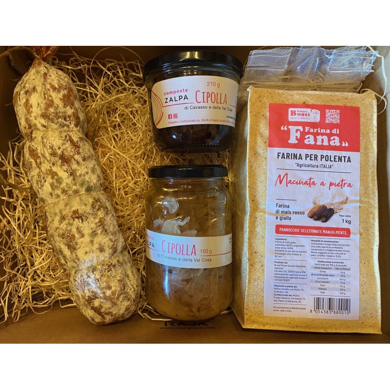 farina di Fana (macinata a pietra), salame, composta di cipolla Rosa della Valcosa e cipolla rosa della Valcosa sott'olio.